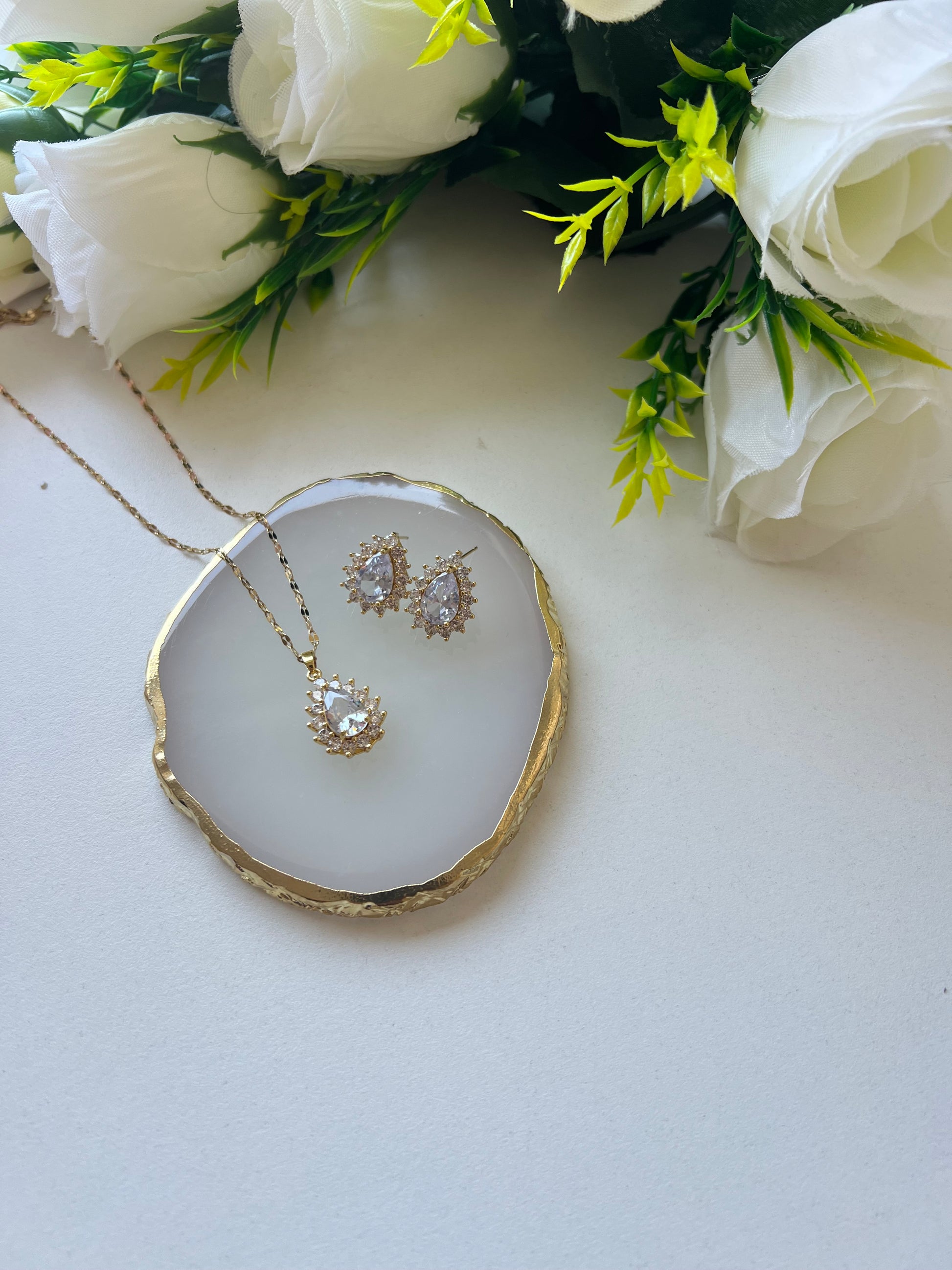 Clássico, leve e cheio de brilho, o Conjunto Jasmine é a escolha ideal para quem ama a elegância do cristal transparente. Composto por colar e brincos em aço inoxidável, ele une sofisticação e durabilidade em um design atemporal.