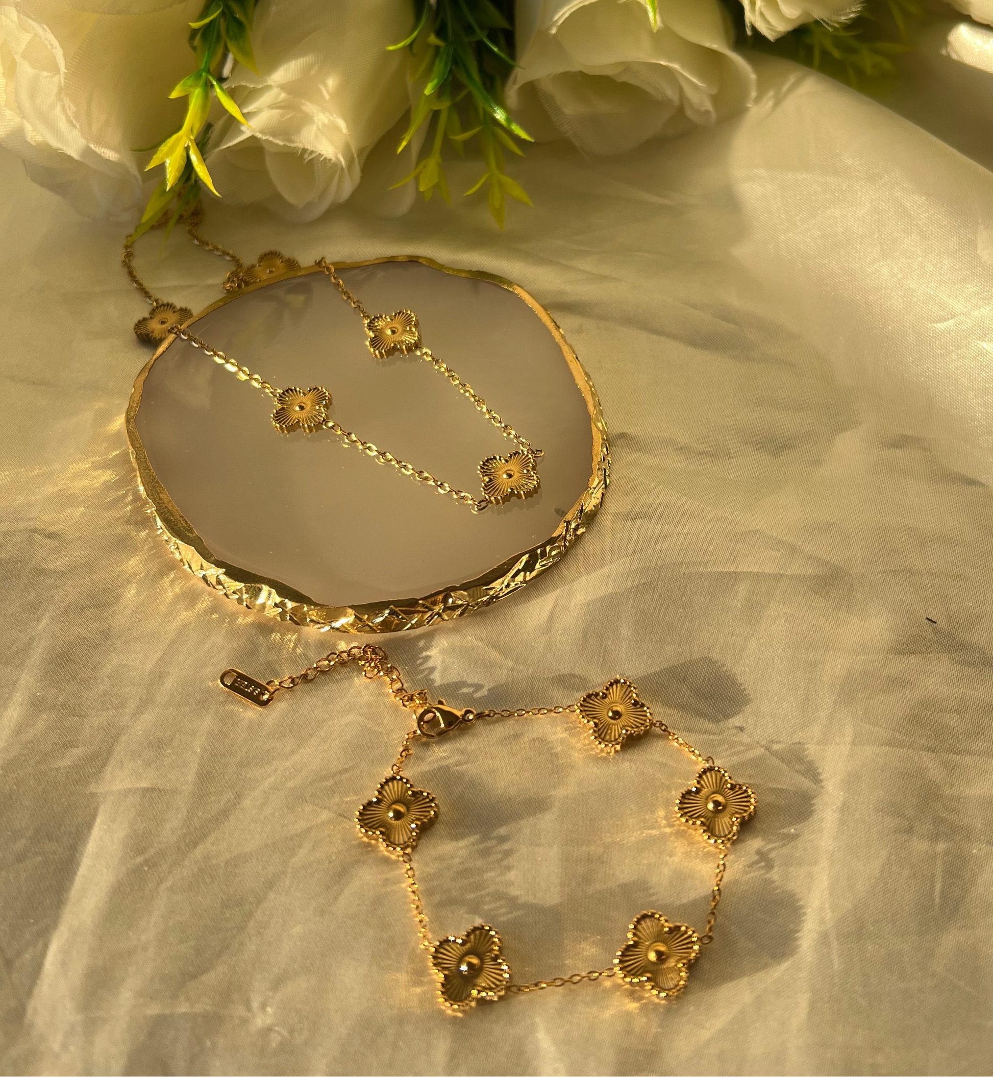 Este lindo conjunto é composto por um colar e uma pulseira com pingentes em formato de trevo, com fundo dourado e base texturizada também dourada. Feito em aço inoxidável de alta qualidade, é resistente à oxidação, à água e ao desgaste do dia a dia — perfeito para usar por muito mais tempo sem perder o brilho!